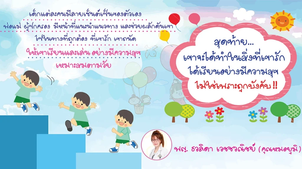 วันนี้เราได้พาผู้อ่านทุกท่าน มาพูดคุยกับ คุณหมอ พญ.ธวลิดา เวชชวณิชย์ (คุณหมอยูมิ) แพทย์ผู้เชี่ยวชาญด้านพัฒนาการเด็ก แพทย์เจ้าของโรงเรียนเสริมสร้างพัฒนาการสมอง และอัจฉริยภาพทางวิทยาศาสตร์ คณิตศาสตร์ DoctorKidSchool หรือที่เรียกกันติดปากว่า “บ้านคุณหมอ” ซึ่งพ่อแม่ผู้ปกครองหลายท่านที่อยากให้ลูกเรียนเก่ง ฉลาด ให้ความไว้วางใจในการส่งลูกๆ ไปฝึกเรียน ฝึกเล่น ฝึกคิด ฝึกพัฒนาสมอง EF กับคุณหมอ คุณหมอเล่าว่า คุณหมอเป็นคุณหมอผิวหนัง เป็นแพทย์หัวหน้าศูนย์ความงาม รพ.เอกชนชื่อดัง มีคลินิกความงามของตัวเอง และเป็นแพทย์ที่ปรึกษาให้กับแบรนด์เครื่องสำอางชั้นนำหลายๆ แบรนด์ หลังจากเริ่มตั้งครรภ์และมีลูกฝาแฝดชาย-หญิง เนื่องจากอยากให้ลูกเรียนเก่ง อยากให้ลูกฉลาด อารมณ์ดี มีความสุข จึงหันมาสนใจด้านพัฒนาสมอง EF ของเด็ก และได้ฝึกอบรมเรียนต่อยอดด้านผิวหนังเด็ก และพัฒนาการเด็กเพิ่มเติม ทำให้ทราบถึงความต้องการและปัญหาของพ่อ แม่ ว่าต้องพบเจอกับอะไรบ้าง จะมีวิธีแก้ไขอย่างไร “ทำอย่างไรให้ลูกเก่ง ฉลาด อารมณ์ดีและมีความสุข